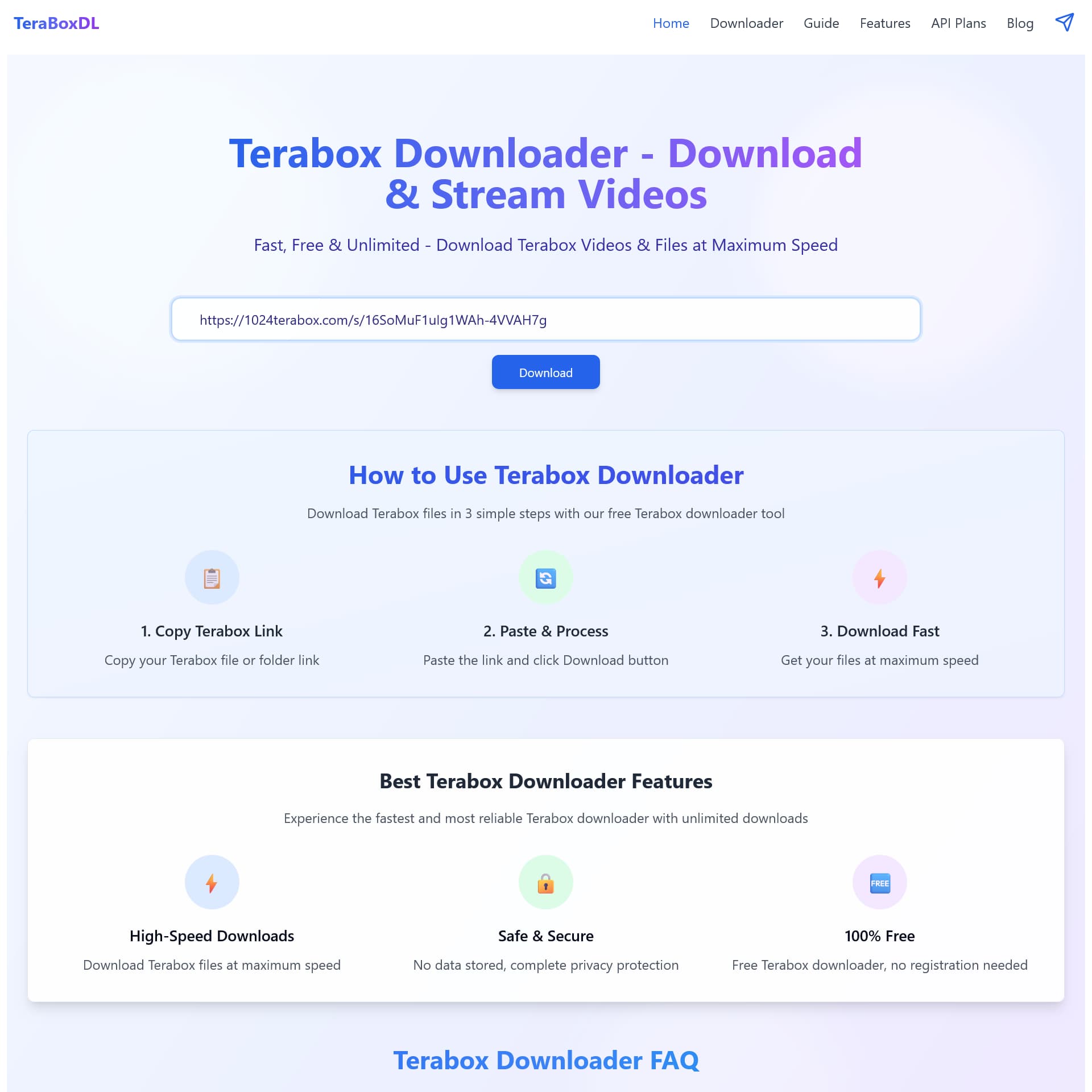 Terabox Downloader (TeraboxDL) adalah alat online gratis, cepat, dan tak terbatas untuk mengunduh serta streaming file dari layanan penyimpanan cloud TeraBox. Pengguna cukup salin tautan TeraBox, tempelkan ke situs, dan unduh file secara langsung dari server TeraBox tanpa batasan kecepatan.
